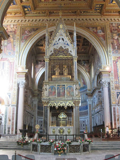 A focal point of the Lateran Basilica is the ornate baldacchino in which are housed two bronze busts of the holy apostles Peter and Paul, containing relics of their skulls. Because the altar is the privileged place on which we celebrate Christ's redemptive act, the baldacchino draws our eyes upward symbolizing the connection between heaven and earth that takes place during the Holy Sacrifice of the Mass.